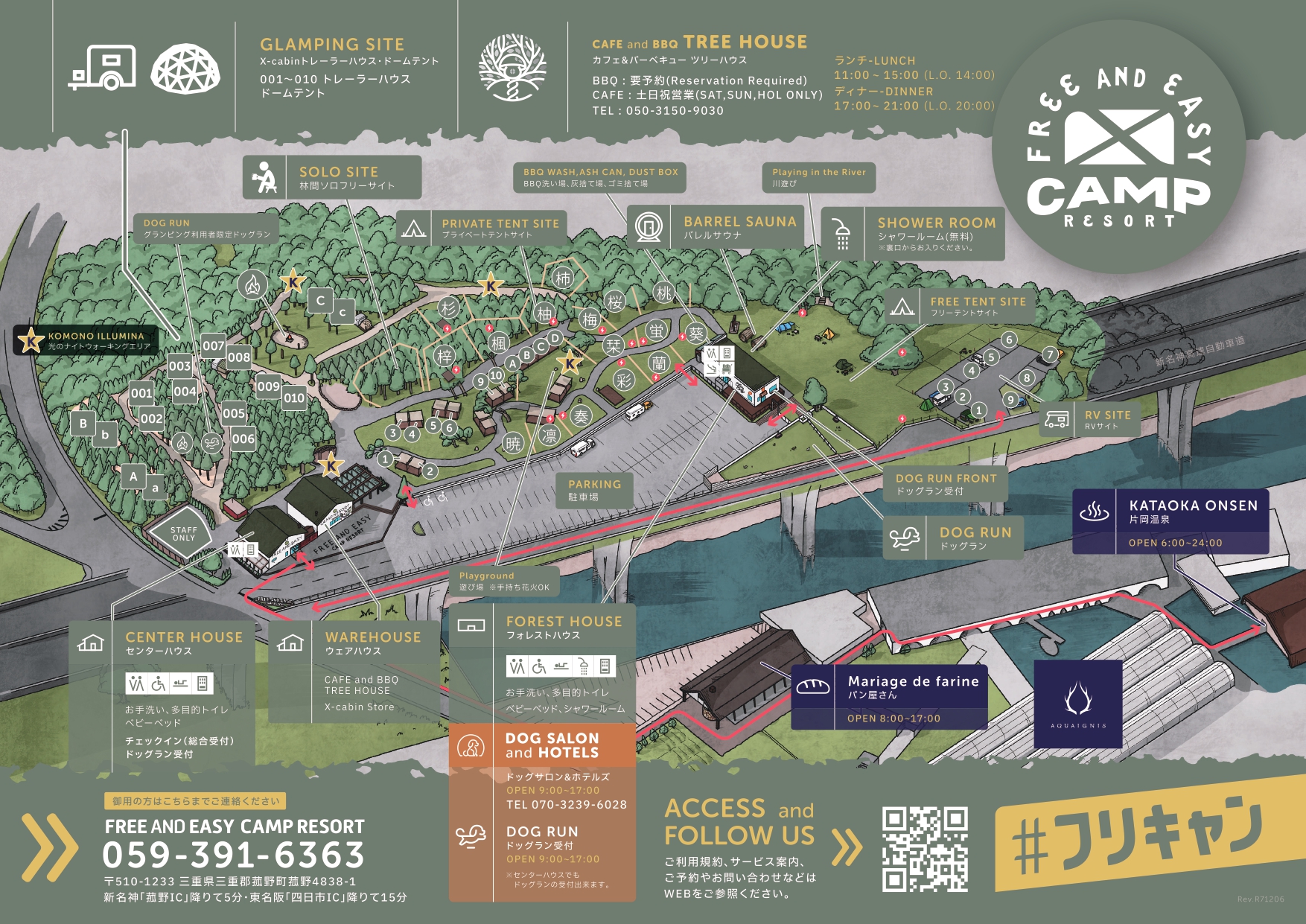フリーアンドイージーキャンプリゾートには「密」を避けてアウトドアを満喫できるキャンプサイトとキャンピングトレーラー「X-cabin300」で気軽に非日常的な空間を楽しめるX-cabinトレーラーサイト、日帰り手ぶらBBQやドッグラン・ドッグサロン、貸切サウナ施設などを完備、キャンプしながら併設している片岡温泉「アクアイグニス」の入浴利用もできるキャンプリゾートです。